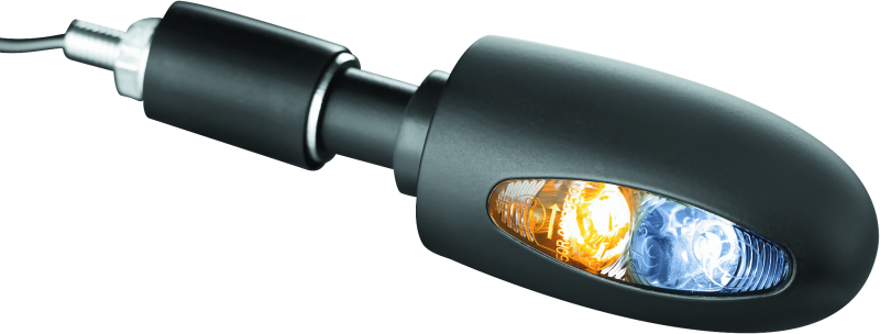 Bar-end turn signals have never been this stylish or functional! The Kuryakyn Kellermann BL 1000 Collection integrates ultra-bright white LED running lights and amber LED turn signals in a sturdy aluminum housing that also helps dampen handlebar vibration. The amber turn signal is visible from the front and rear of the motorcycle, depending on handlebar width. Kellermann housings are available in a chrome or black finish.